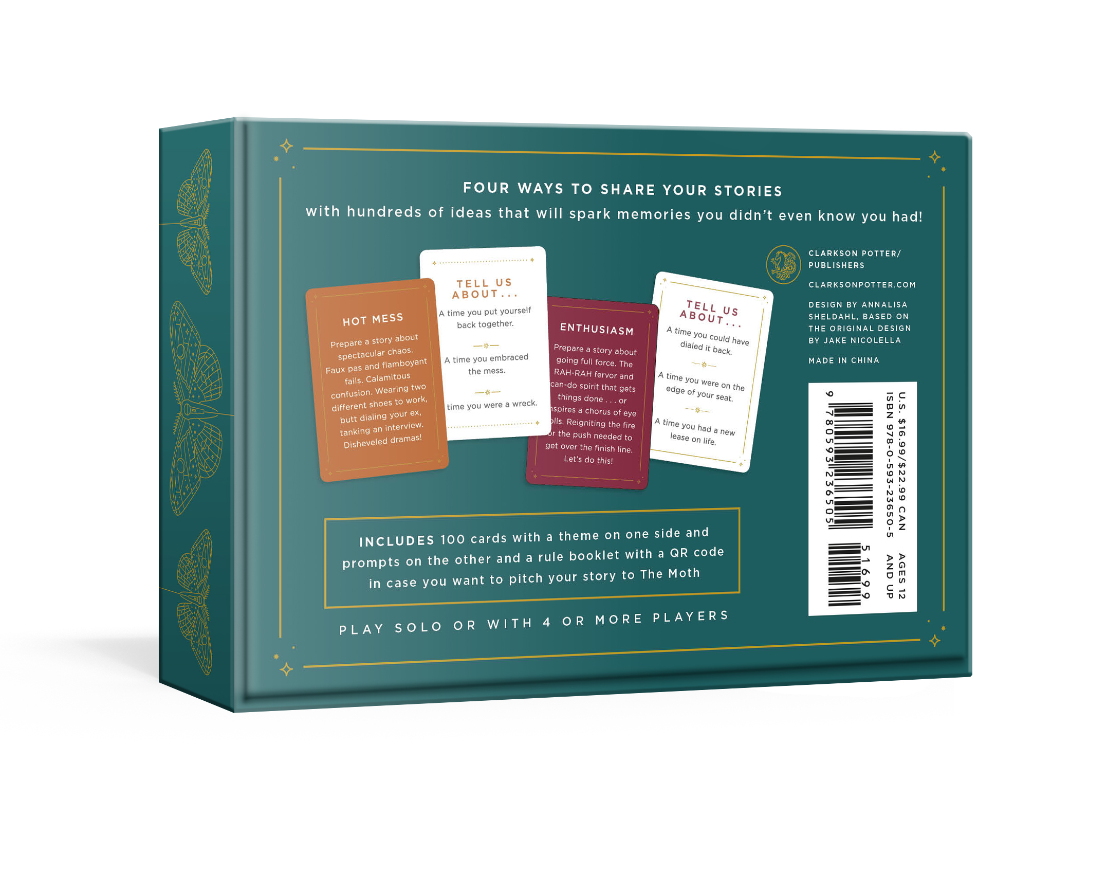 Since 1997, The Moth has engaged thousands of fans through their celebrated live shows, workshops, and The Moth Radio Hour and The Moth Podcast. A Game of Storytelling features 100 themes, including Love Hurts, Mama Rules, Busted, Fuel to the Fire, Lifelines, Hot Mess, Chemistry, Duped, and many more. Over 300 additional prompts offer riffs on the themes to spark your stories.